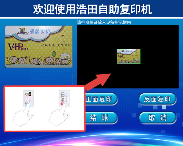 浩田自助二代身份證打印機(jī)可以進(jìn)行二代身份證快速復(fù)印、掃描復(fù)印和讀卡器復(fù)印,可以微信、支付寶、投幣支付,投放在地鐵、機(jī)場(chǎng)、車站、辦證大廳、銀行、學(xué)校等人流密集地