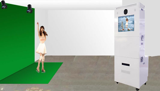傳統的照相機,包括數碼照相機都是以實際景物為背景,由他人為照相者拍攝,或由照相者啟動自拍功能后跑到相應位置,延時數秒后拍攝。照相者不能看到自己在拍攝時的表情,拍攝的效果要在事后才能看到。在安裝有數碼攝像頭的計算機面前,照相者可以實時拍攝到能看到的自己表情的影像,但不能實時拍攝到自己在期望的虛擬背景下的影像,當然更不能實時拍攝到在一張照片上。從不同角度能看到不同影像的動感照片。基于藍背景摳像技術的虛擬環境下的實時自助照相技術,它能將自助式照相、可選虛擬背景下照相和將多次拍攝的影像互補合成為動感照片的功能集成在一起,以便照相者發揮自我個性,展示自我風采。