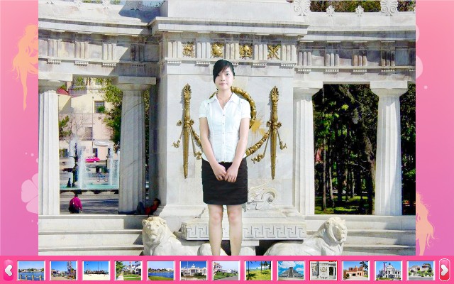 選好背景圖后按“拍照”鍵進入到拍照界面,你還可以根據背景的實際情況調節好人的大小“放大/縮小,人物的位置“方向鍵”。調整好后就按“拍照”鍵進行拍照